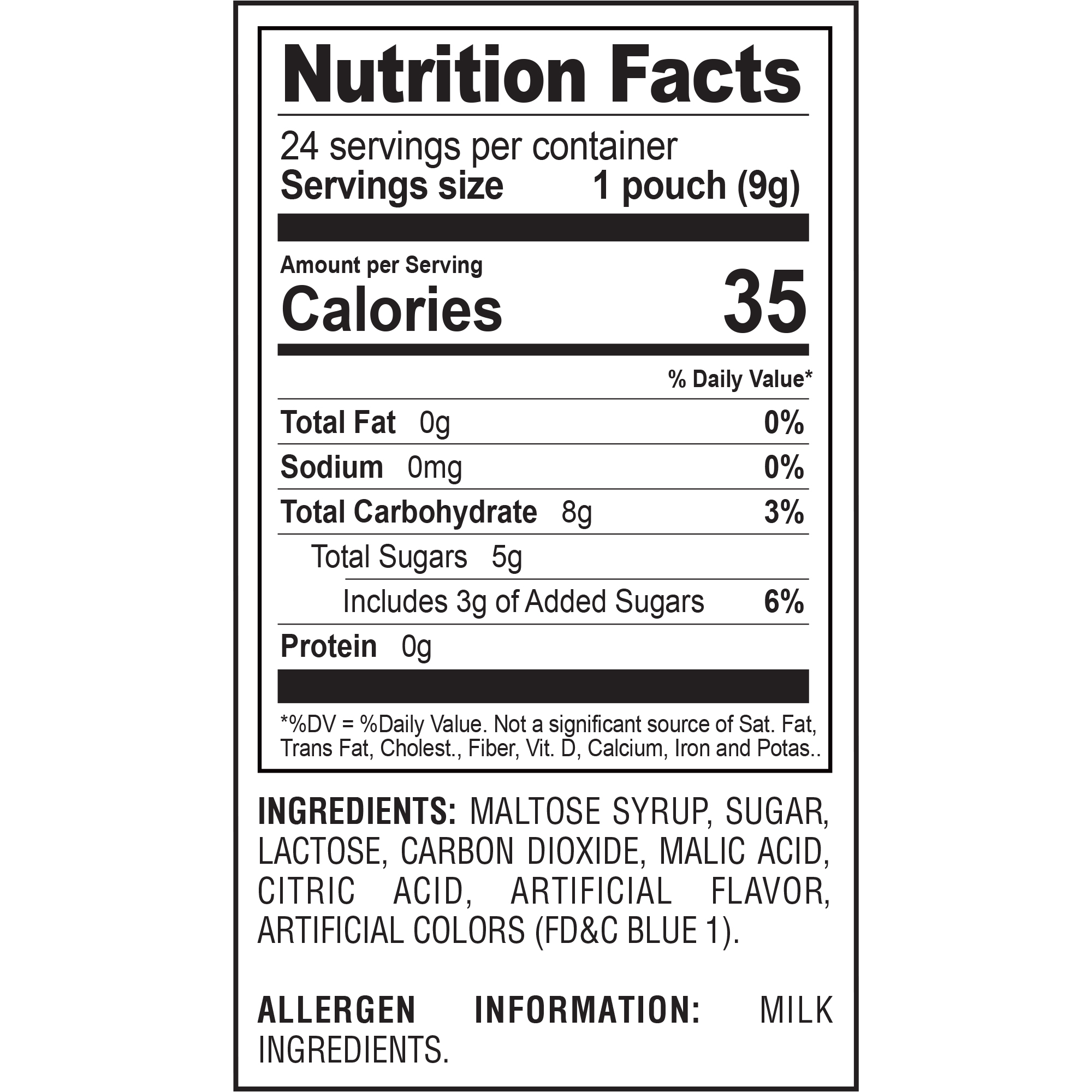 MALTOSE SYRUP, SUGAR, LACTOSE, CARBON DIOXIDE, MALIC ACID, CITRIC ACID, ARTIFICIAL FLAVOR, ARTIFICIAL COLOR (FD&C BLUE 1).
