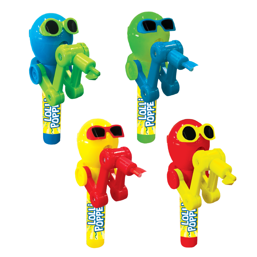 The four different colored characters with cool shades hold in their hand a delicious mouthwatering watermelon-flavored lollipop that will flip your lid each time you pull the trigger. The lollipop keeper character keeps the lollipop safe, but the character will share it with you. Pulling the trigger flips the character’s lid, and the flavor of the lollipop will flip your lid!